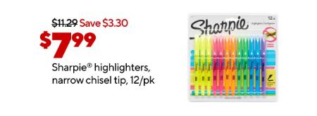 Don't miss out! Shop in store and get $7.99 on Sharpie® highlighters, narrow chisel tip, 12/pk.