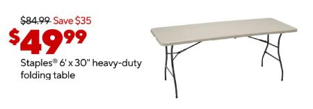 Don't miss out! Shop in store and get $49.99 Staples® 6 x 30'' heavy-duty folding table.